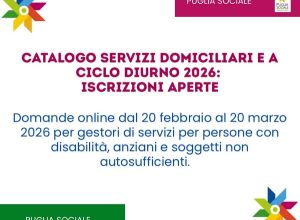 Si rende noto che con Determinazione Dirigenziale n. 97 del 11/02/2026 è stata disposta l’apertura della finestra temporale 2026-2027 per l’iscrizione ex novo, la conferma o l'aggiornamento dati del Catalogo telematico dell'offerta dei servizi domiciliari e a ciclo diurno per persone con disabilità, anziani e non autosufficienti.